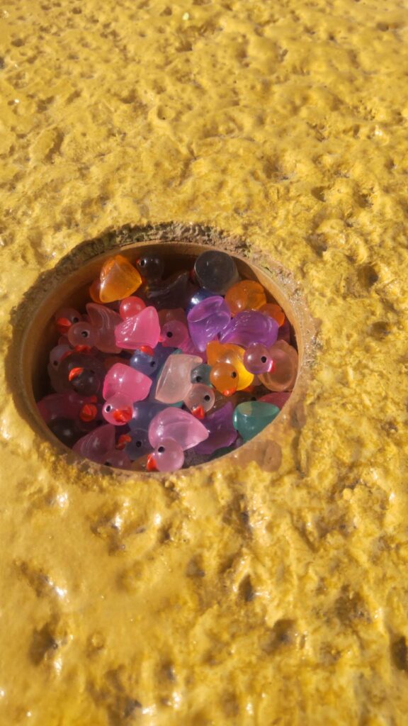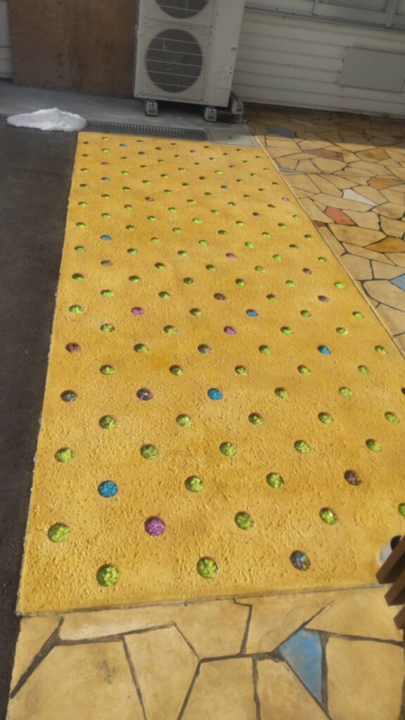発色の良い黄色のスタンプコンクリート施工⭐️ 穴にカラフルなビーズやひよこが入ってるのが可愛いですね😍🐤