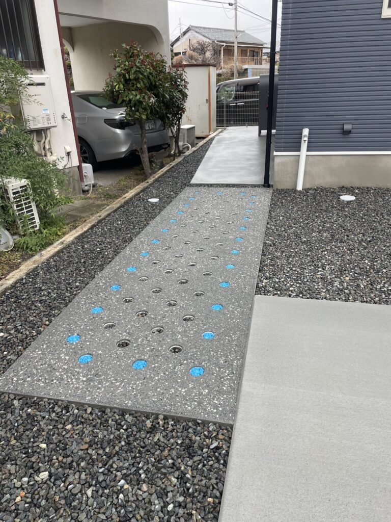 沼津市にて、普通生コンの洗い出しでドットコンアプローチ(5㎡、パネル4枚使用)をDotcon施工👷 とてもおしゃれでスタイリッシュなアプローチになりましたね!✨