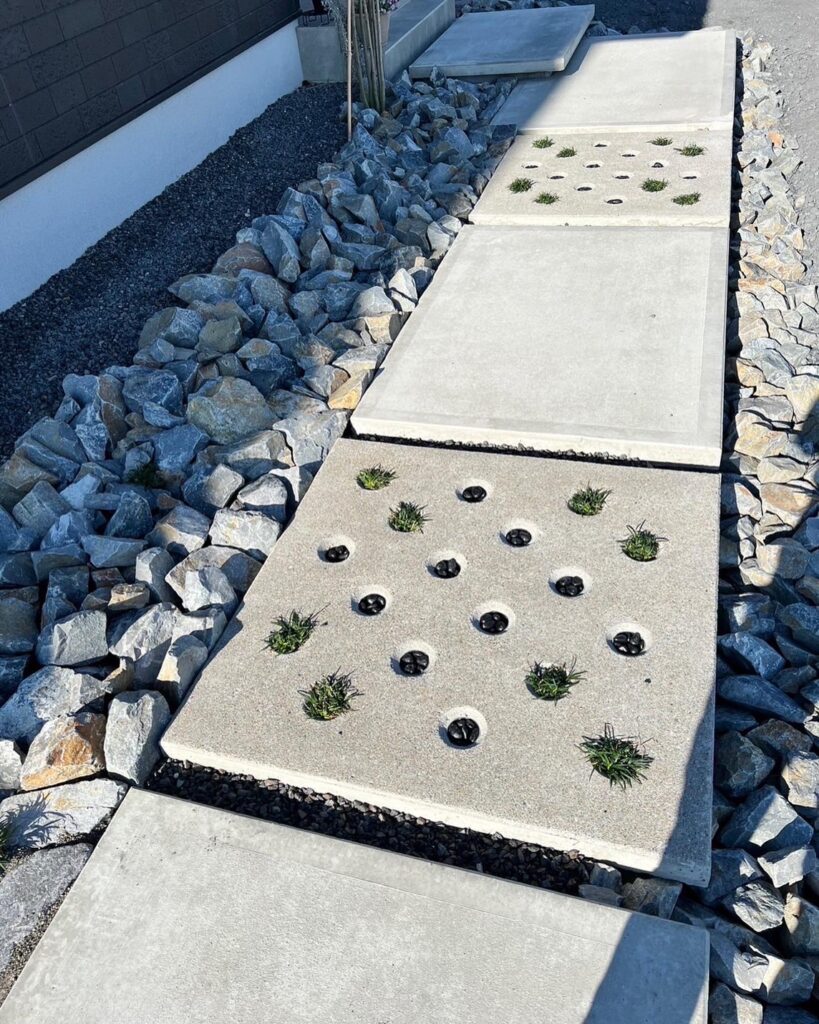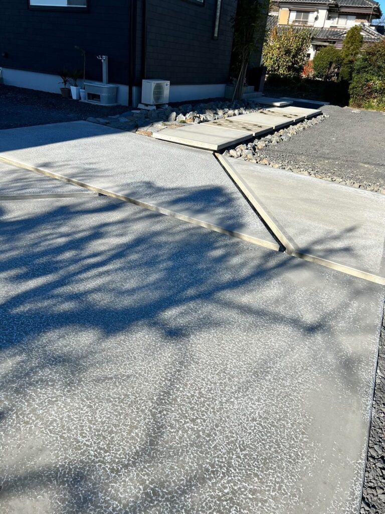 Dotconは、戸建住宅のエクステリアにもご活用いただけます。 全面をドットコンで施工するのに抵抗がある方は部分的にドットコンを使用することもできます! 今回は、通常のコンクリートとドットコンを交互に施行し、脇にライトを設置しました。 夜にはライトが付き、モダンな雰囲気を演出できます!