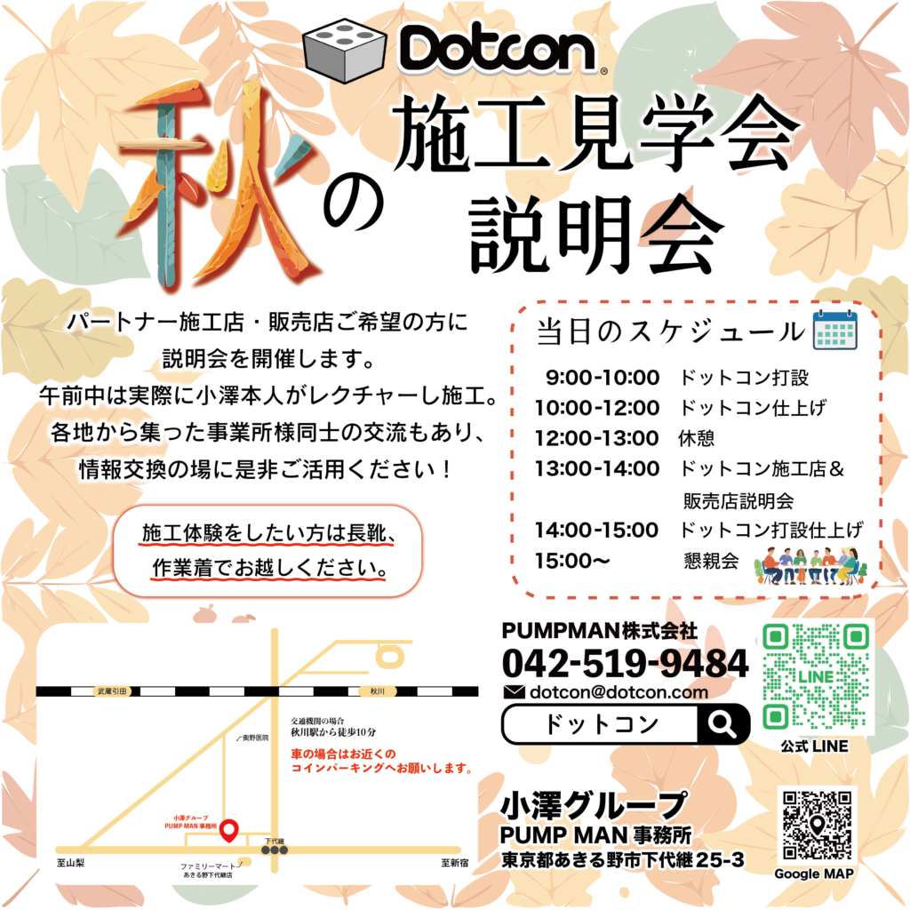 Dotcon施工見学会につきまして、雨天時は中止とさせていただきます。9月27日(金)の前日までは天候を確認しながら様子を見て、最終的な判断をいたします。中止の場合は、ホームページにてお知らせいたしますので、ご確認をお願いいたします。